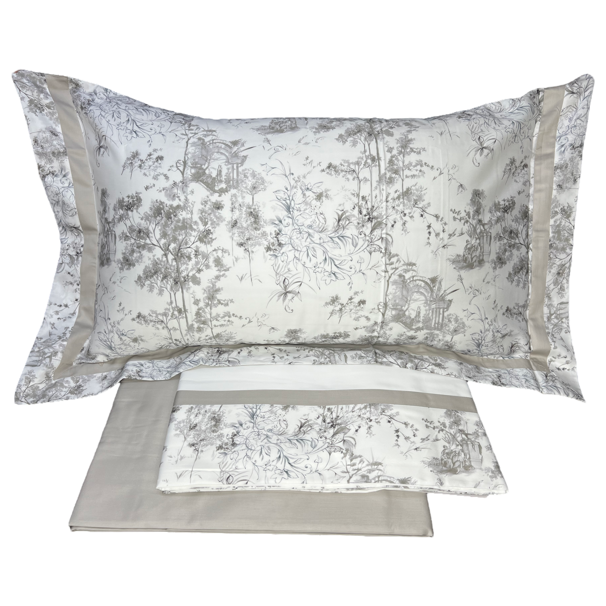 Completo letto matrimoniale con stampa digitale su raso di puro cotone. Stampa elegante e raffinata con fiori in nuance delicate. Perfetta per un arredo letto classico e moderno per donare freschezza alla zona riposo senza rinunciare alla qualità del raso di puro cotone.