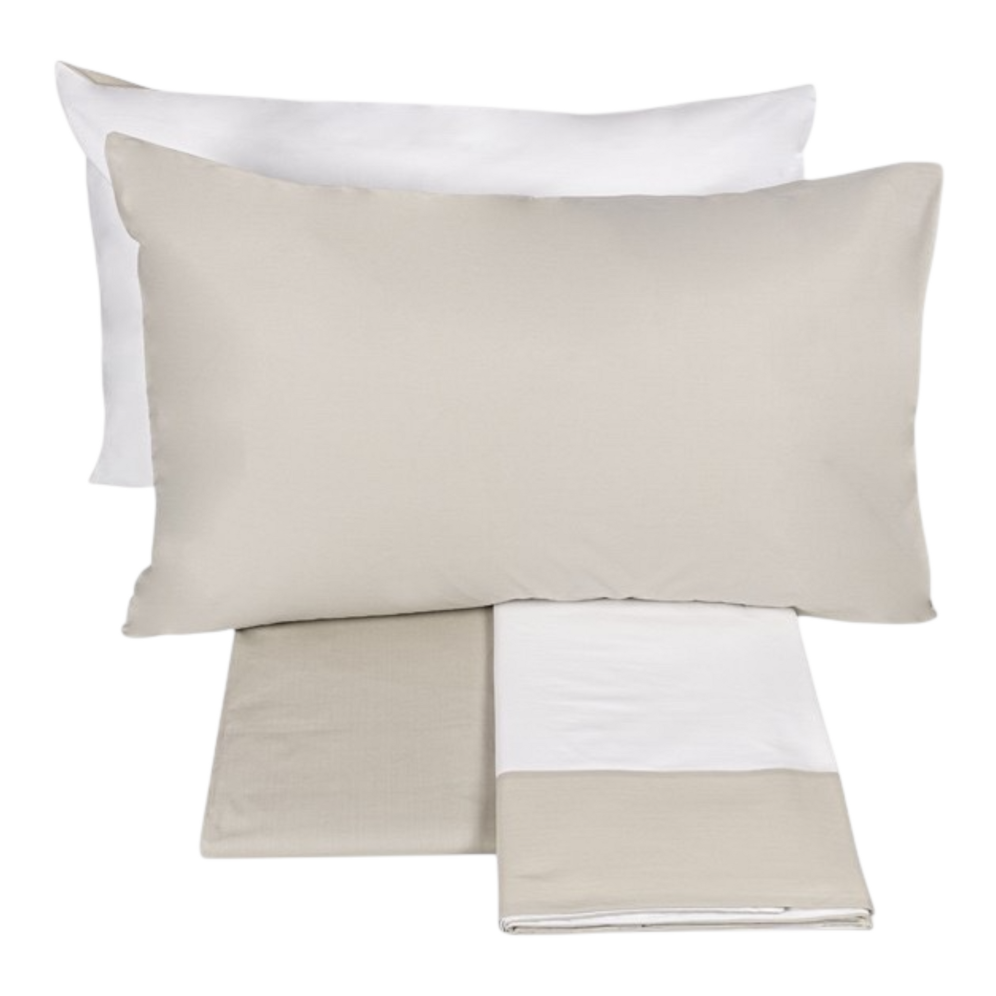 Dialogo è una coppia di lenzuola singole in tinta unita con balza a contrasto e federa reversibile.